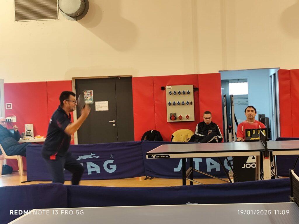 En départementale 1, poule 1, nos équipes 2 et 3 s’affrontaient dans des duels fratricides. Forte d’un gros avantage aux points, l’équipe 2 se montre impitoyable. En simple, Natacha, Mehdi et Pascal S font carton plein, seul Dominique concède une partie face à Patrice. Du côté des doubles, la domination est totale : Dominique et Mehdi viennent à bout de Patrice et Gilles, tout comme Natacha et Pascal S face à Robert et Jean-Claude G. L’équipe 2 l’emporte donc par 13 à 1, mais l’équipe 3 s’est battue vaillamment.